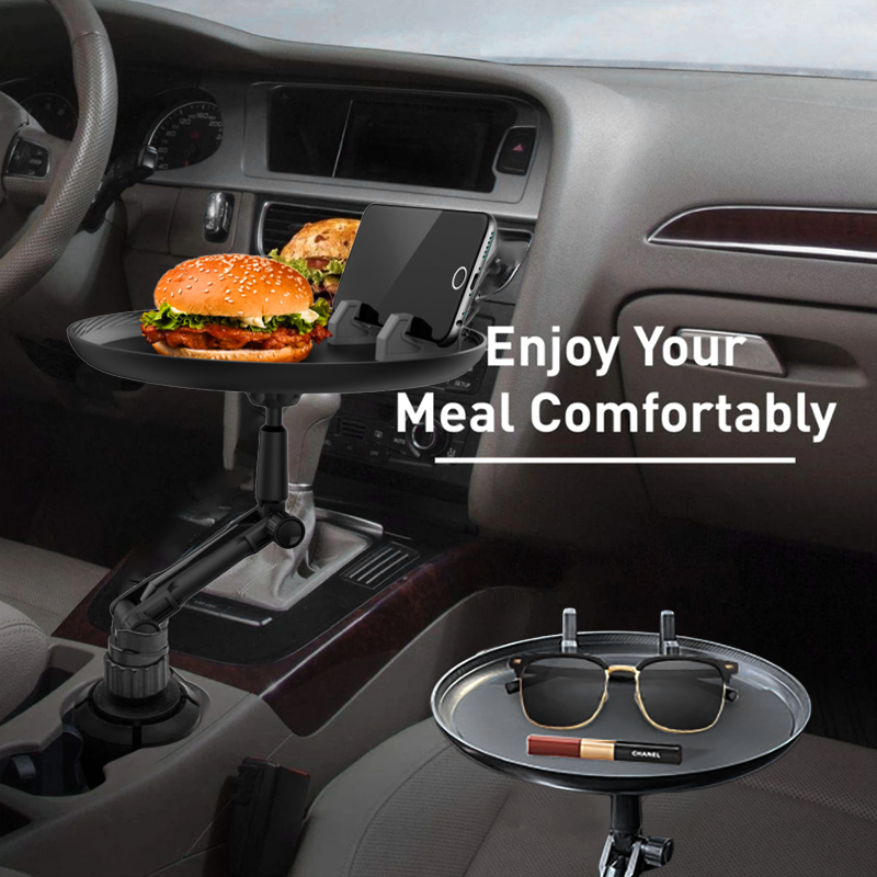 Cup holder tray for car, a convenient and practical addition to your car. lt has 360-Degree Swivel design locks inplace. Just insert the car tray into your car cup holder, enjoy your meal and stay organized.